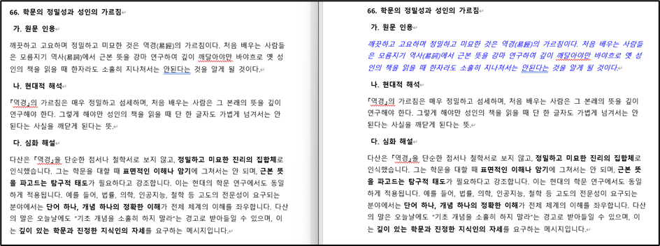 다산 정약용 선생님의 '유배지에서 보낸 편지'의 주요 문구를 정리하고 나름의 해석을 붙인 문서를 만든 다음, 원문 부분을 '기울임꼴'과 '파랑'으로 적용하고자 했습니다(아래 이미지 참조). 전체가 68개 항목이므로, 68번의 반복되는 수작업을 대신하, 간단한 Word 자동화 프로그램을 파이썬으로 구현하여 0.1초만에 정리를 한 코드입니다.