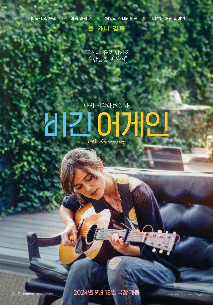 비긴 어게인(Begin Again, 2014)은 존 카니(John Carney)가 감독하고 각본을 쓴 영화입니다. 주요 출연진으로는 키이라 나이틀리(Keira Knightley)와 마크 러팔로(Mark Ruffalo), 애덤 리바인(Adam Levine), 헤일리 스테인펠드(Hailee Steinfeld), 제임스 코든(James Corden), 야신 베이(Yasiin Bey), 그리고 씨로 그린(CeeLo Green)이 있습니다.